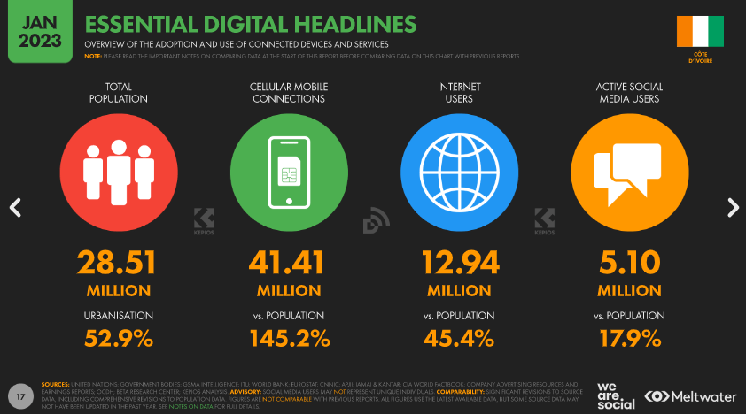 Derrière le Nigéria et le Ghana, la Côte d’Ivoire dispose d’un bon score en termes de chiffres sur Internet et les Réseaux sociaux. Pour 2023, voici ses chiffres !