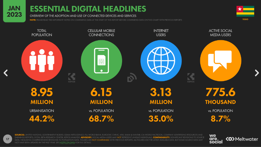 Pour ce pays de l’Afrique de l’Ouest, il progresse depuis quelques années dans le Digital. Voici les chiffres Internet et Réseaux sociaux pour le Togo en 2023.